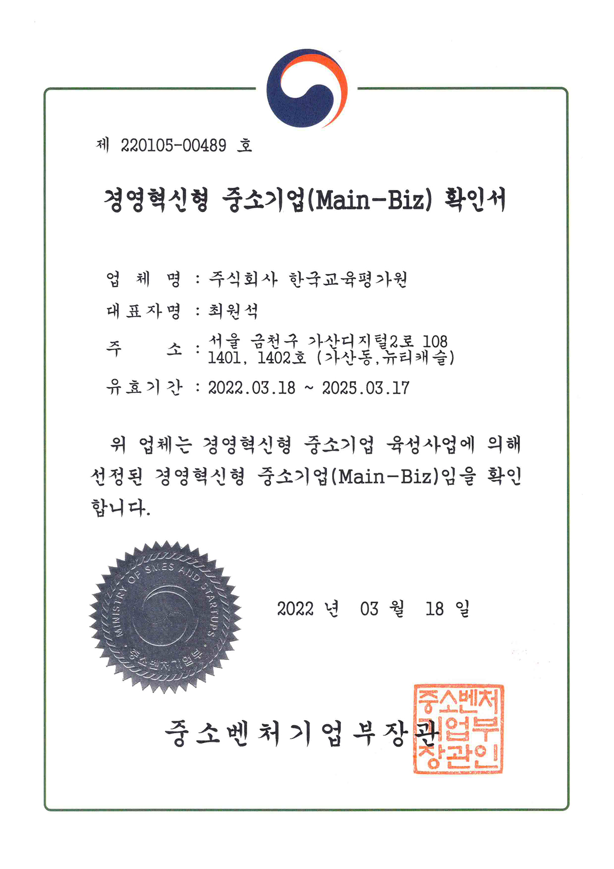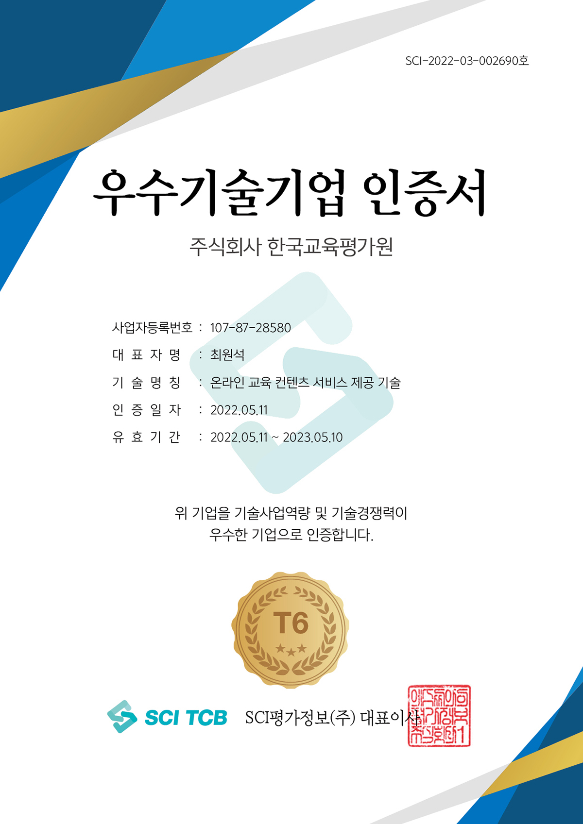 2022.05 ¿ì¼ö±â¼ú±â¾÷ ÀÎÁõ T6 Ãëµæ